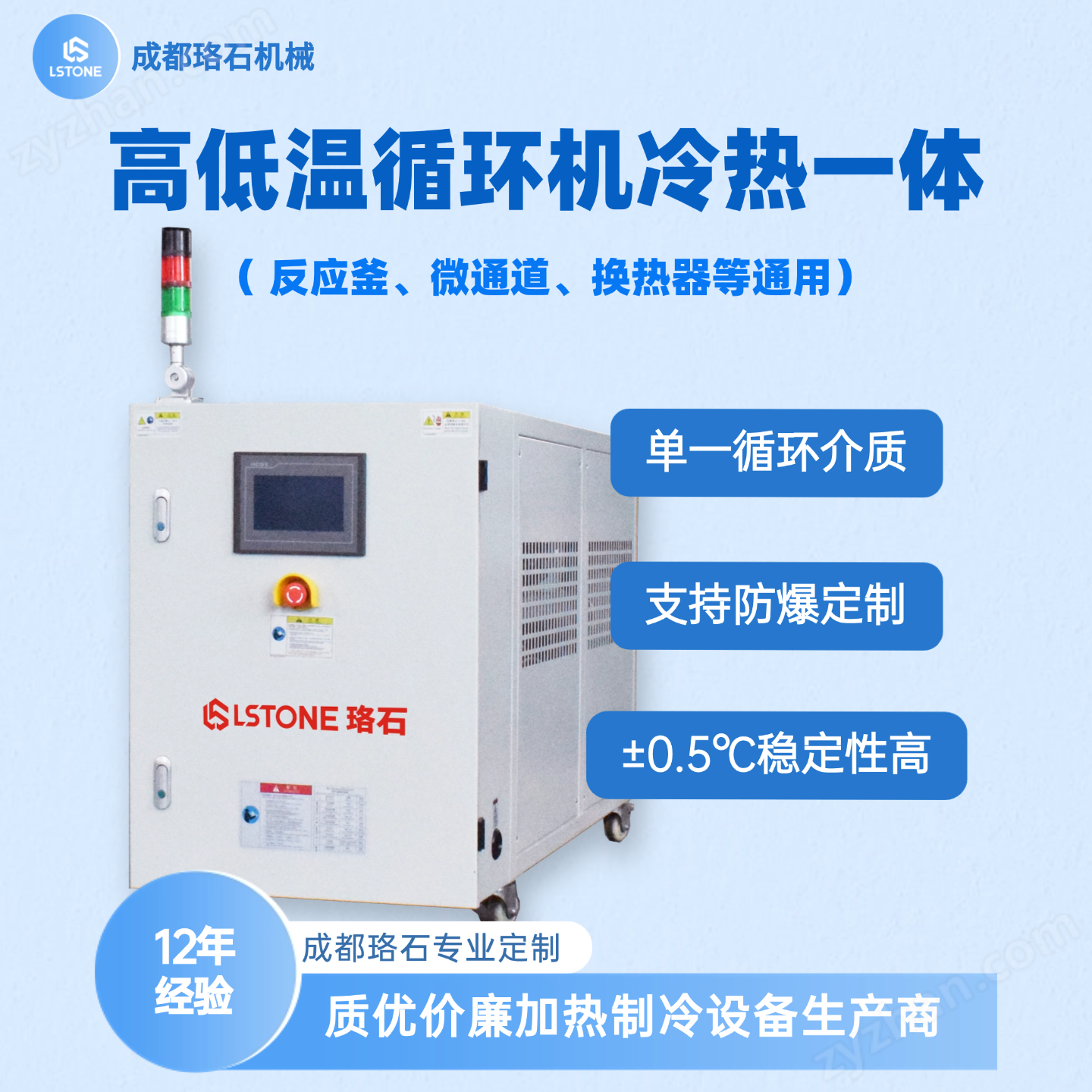 目前成都珞石機械的高低溫一體機類型有:-80至200℃高低溫一體機、-30至200℃高低溫一體機、風冷式高低溫一體機、冷式高低溫一體機、冷水機、tcu溫控單元等多種機型可選。已經(jīng)廣泛服務于川渝醫(yī)藥化工、新能源、復合材料、測試、科研院校等多個行業(yè)。