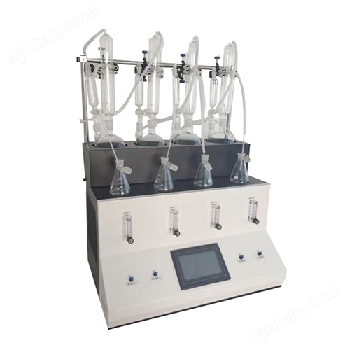 主要原理是根據(jù)藥典中所提供的檢測方法,將中藥材以蒸餾法進(jìn)行處理,樣品中的亞硫酸鹽系列物質(zhì)加酸處理后轉(zhuǎn)化為二氧化硫后,隨氮?dú)饬鲙氲胶须p氧水的吸收瓶中,雙氧水將其氧化為硫酸根離子,采用酸堿滴定法測定,計算藥材及飲片中的二氧化硫殘留量。本產(chǎn)品在嚴(yán)格遵循藥典要求的基礎(chǔ)上,整合加熱,蒸餾,水循環(huán)及氮吹等功能為一體,可同時提供3-5個樣品(空白樣,平行樣)的處理,從而極大的提高了檢測數(shù)據(jù)的精度和減少了工作時間。