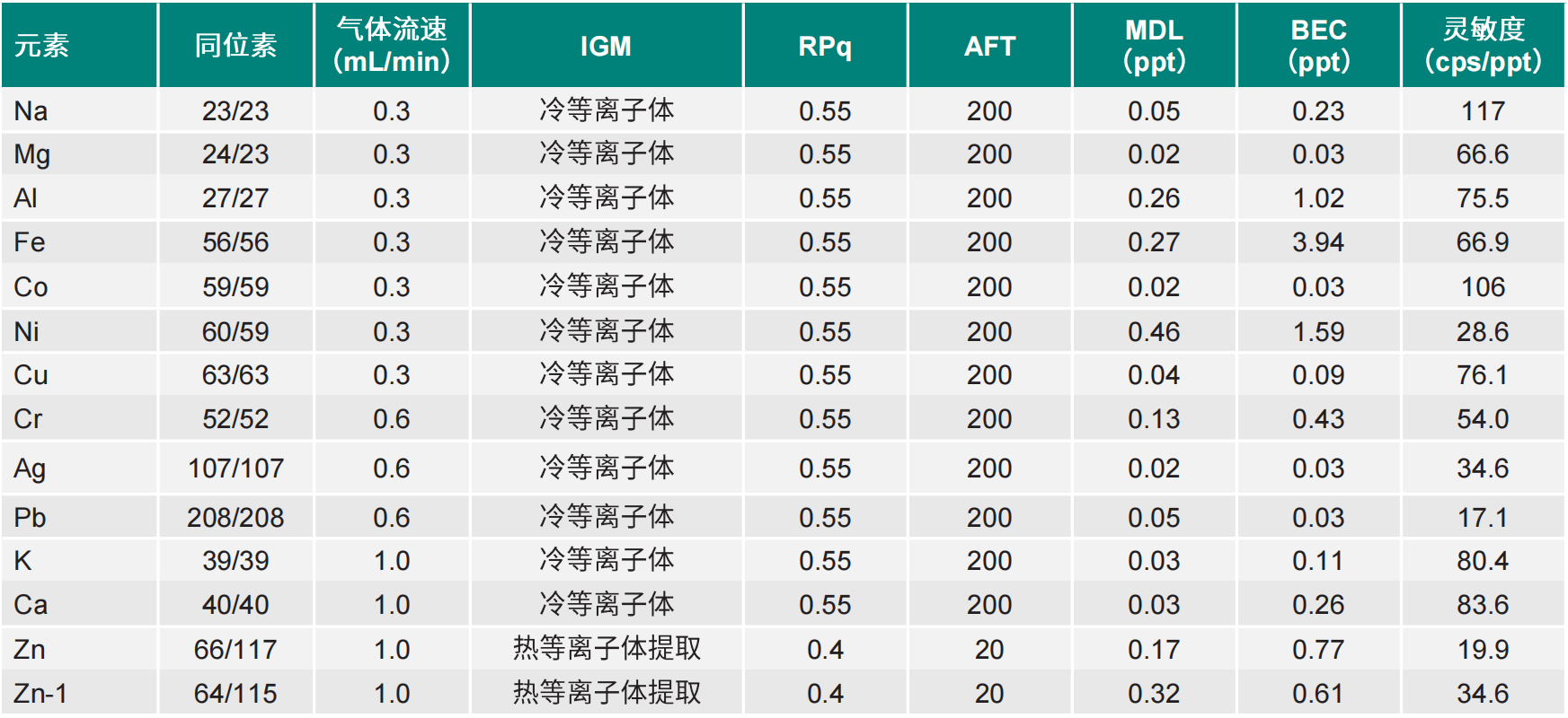 ?Zn的第一電離能高于其他目標元素,且缺乏主要同位素因此其靈敏度本來就較低。此外,9.8%硫酸的信號抑制會進一步降低靈敏度。對于超痕量分析而言,保持足夠的靈敏度至關重要,因為這直接決定了檢測限和數(shù)據(jù)準確度。