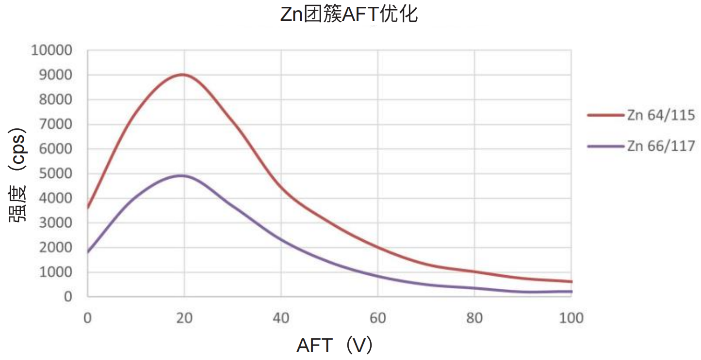 圖2.Zn團簇(66/117和64/115)的靈敏度隨AFT變化的函數(shù),使用200 ppt Zn元素標準溶液在9.8%硫酸中測量(點擊查看大圖)