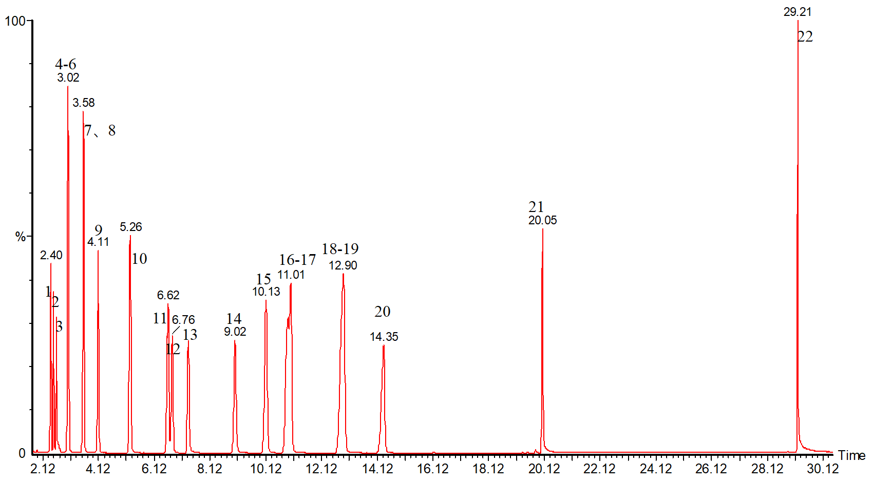 1、正己烷;2、乙酸乙酯;3、三氯甲烷;4、苯;5、四氯化碳;6、環(huán)己烷;7、正庚烷;8、三氯乙烯;9、甲基環(huán)己烷;10、甲苯;11、正辛烷;12、四氯乙烯;13、乙酸丁酯;14、氯苯;15、乙苯;16-17、間,對-二甲苯;18、苯乙烯、19、鄰二甲苯;20、正壬烷;21、1,4-二氯苯;22、正十六烷